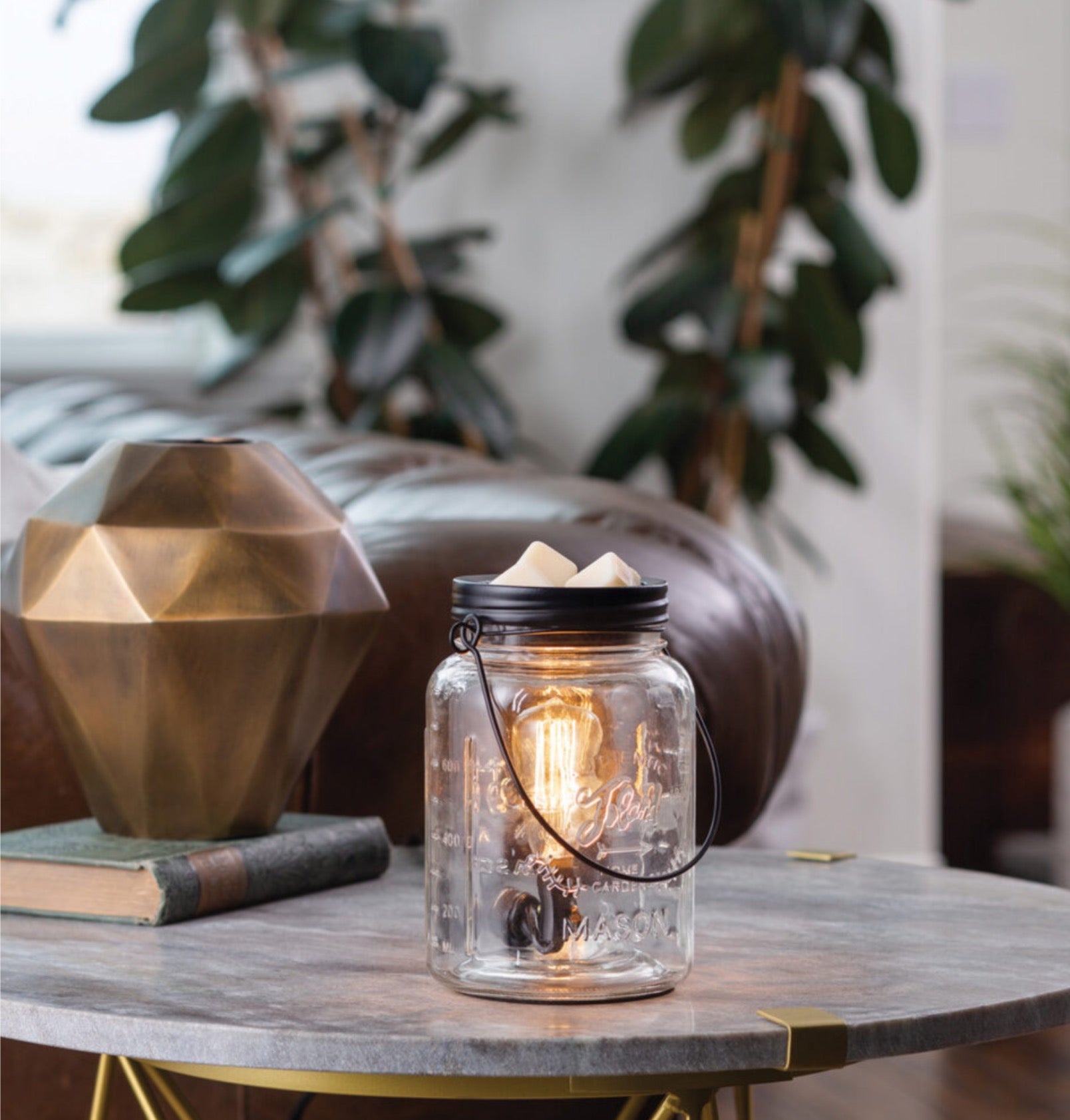 - DESIGN: A timeless classic gets a modern upgrade with our Mason Jar Illumination Warmer. Featuring crystal-clear glass paired with a matte black warming dish and handle, this piece brings a refined, repurposed charm to any space. The vintage-style warming bulb adds a soft, inviting glow—highlighting every detail and creating a cozy ambiance with rustic elegance.
