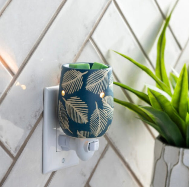 - DESIGN: Bring a luxurious glow to any space with our Pressed Leaf Pluggable Fragrance Warmer. Finished in a rich peacock blue glaze, this compact warmer features a beautifully debossed leaf pattern that adds texture and sophistication. When lit, it casts a soft, inviting glow—perfect for adding warmth and style to smaller spaces.