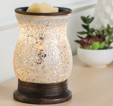 DESIGN: The silver glass mosaic surface of this Illumination Warmer catches the light beautifully, sparkling as it casts a gentle, soothing glow—adding a touch of glamour and warmth to any room.